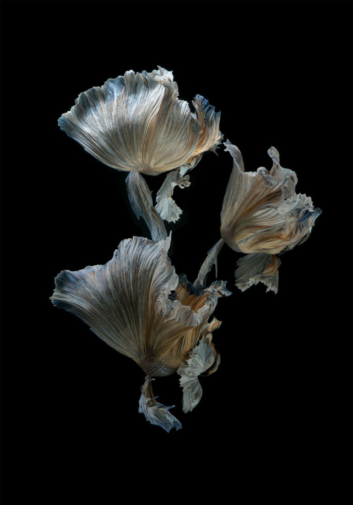 48 yaşındaki Taylandlı fotoğrafçı Visarute Angkatavanich, Kavgacı Siyam Balıkları’nı, farklı bir yönden fotoğrafladı. Arka zemine koyduğu güçlü siyah ve beyaz fonları, kaliteli lensleri ve mükemmel ışıklandırmasıyla, balıklar, sanki suyun içinde değil de havada geziniyormuş gibi fotoğraflandırdı.
