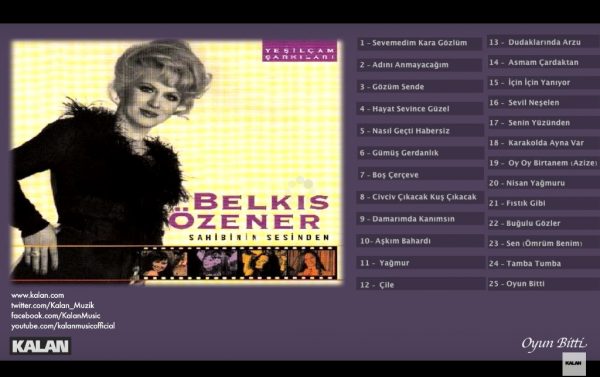 Daha ismini duyar duymaz şarkılar zihnimizde mırıldanmaya başlanıyorsa, bu, Belkıs Özener’in başarısından elbet. Hatta biraz daha devam edelim şarkılarını saymaya: Azize, Fosforlu Cevriye, Gözüm Sende, Hayat Sevince Güzel, Dudaklarında Arzu, Ben Seni Unutmak İçin Sevmedim, Tamba Tumba, Gümüş Gerdanlık, Civciv Çıkacak Kuş Çıkacak, Oyun Bitti…
