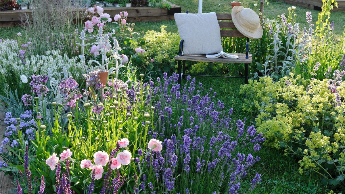 Lavanta, sardunya, ortanca ve farklı yeşil tonlara sahip bitkiler görsel çeşitlilik sağlar. Ancak sadece renk değil, bitkilerin büyüme şekilleri ve katmanlı yerleşimi de göz yormayan, huzurlu bir atmosfer oluşturur.