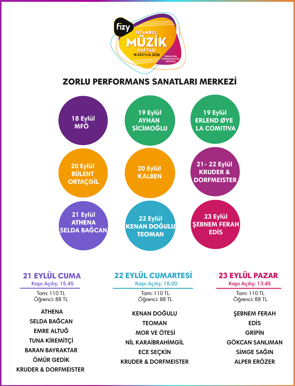 18-23 Eylül Zorlu PSM’de gerçekleşen Fizy İstanbul Müzik Haftası’nda farklı tarihlerde Selda Bağcan, Emre Altuğ, Athena, Teoman, Nil Karaibrahimgil, Edis, Şebnem Ferah gibi 20’den fazla sanatçının konserinin yanı sıra önemli yazarlarla imza günleri de düzenleniyor. Etkinlik detaylarını buradan inceleyebilirsiniz.