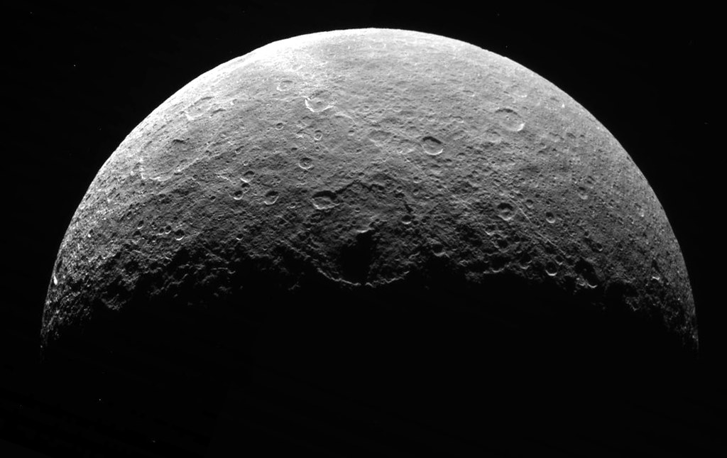 Satürn’ün ikinci büyük uydusu Rhea, yaklaşık 764 kilometrelik çapıyla Oberon’dan biraz daha büyüktür. Gri tonlardaki yüzeyi yoğun kraterlerle kaplıdır ve milyarlarca yıllık çarpışma geçmişini saklar. Jeolojik olarak oldukça sakin bir tablo sunar. Tüm bunların yanı sıra Cassini Huygens görevi sırasında ölçülen yüzey sıcaklıkları uydudaki sıcaklığın -174 dereceye kadar düştüğünü gösteriyor. Büyük çatlak sistemleri ya da aktif volkanlar gözlenmez. Bu sakinlik, Rhea’yı Satürn sisteminin erken dönem tarihini anlamak için değerli bir örnek yapar. Ay’a benzer görünümü sayesinde karşılaştırmalı çalışmalar için ideal bir laboratuvar niteliğindedir.