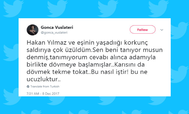 Hakan Yılmaz olayı Twitter hesabından paylaştı. Bu çirkin olayı kınıyor, kendilerine ve eşine geçmiş olsun dileklerimizi iletiyoruz.