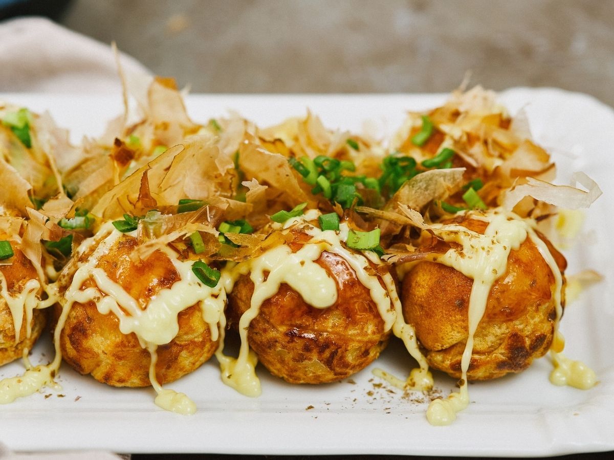 Takoyaki, Japon sokak yemeklerinin belki de en bilinen ve en eğlenceli örneklerinden biri. Kansai bölgesinde, özellikle Osaka ve Kobe sokaklarında neredeyse her köşe başında karşınıza çıkıyor. Dışı hafif çıtır, içi yumuşak olan bu küçük topların içinde doğranmış ahtapot parçaları bulunuyor. Hafif krep hamuruna karıştırılan ahtapot, özel yuvarlak kalıplarda sabırla pişiriliyor. Satıcıların tek bir çubukla bu topları saniyeler içinde çevirmesini izlemek başlı başına bir gösteri gibi. Piştikten sonra üzerine yeşil soğan, bonito pulları ve tatlı takoyaki sosu ekleniyor. İlk ısırıkta hafif yapışkan dokusu sizi şaşırtabilir ama ardından gelen yoğun tatlar bu şaşkınlığı keyfe dönüştürüyor.
