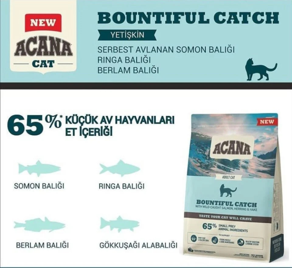 Acana Bountiful Catch, kedinizin kas ve kemik yapısının daha aktif ve güçlü bir yapıya dönüşmesinde etkili bir içeriğe sahiptir. Mama, içeriğinde bulunan vitamin ve mineraller ile kedinizin bağışıklık sistemini koruyarak hastalıklara karşı daha dirençli bir hale gelmesini sağlamaktadır. Kolay sindirilebilir bir formda olması minik dostunuzun sindirim sisteminin de daha aktif hale gelmesini sağlayacaktır. İçeriğinin yüksek oranda somon ve ringa balığından oluşması kediler için önemli bir problem olan tüy ve deri sağlığı sorunlarının da önüne geçilmesinde en büyük yardımcınız haline gelecektir.
