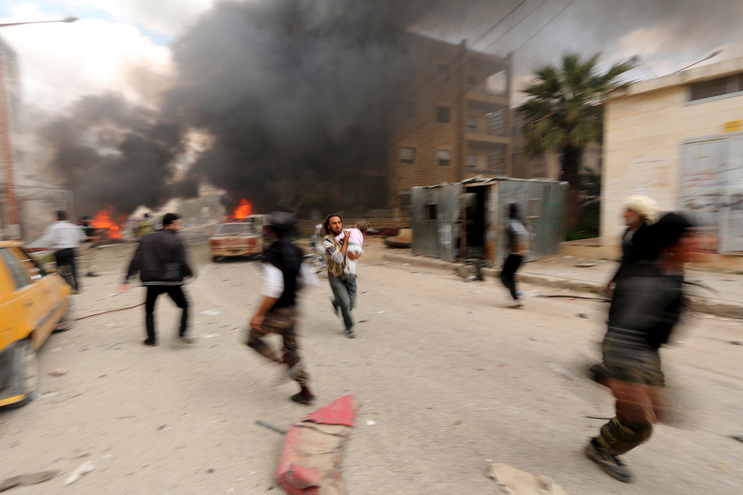 12. Kucağındaki yaralı çocuk ile bombalanmakta olan bölgeden kaçan bir baba