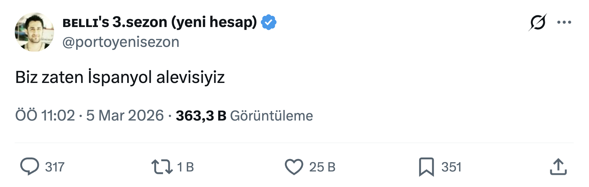 — melisa (@kizginliktayim) March 5, 2026Babama twitterda başlayan ispanya-türkiye dostluğundan bahsederken bir dakika bekle bakim bi deyip içeri gitti ispanya kravatı getirdi şaka gibi.. bi insan niye dolabında ispanya kravatı bulundurur… pic.twitter.com/zSXkGQNYLS